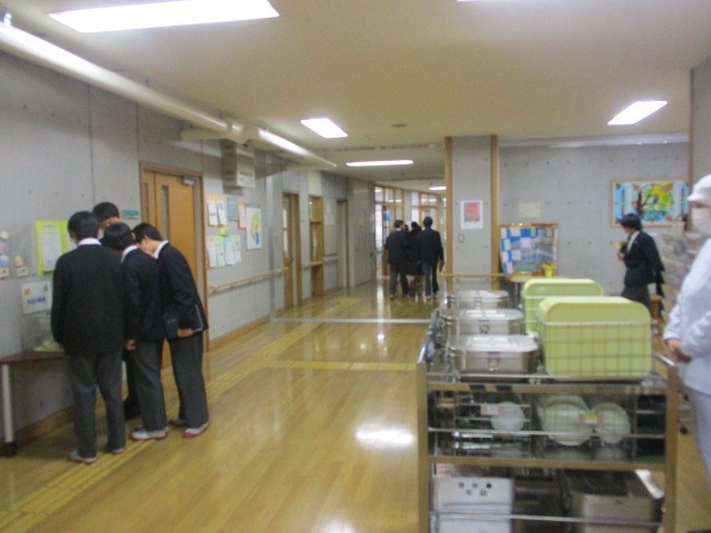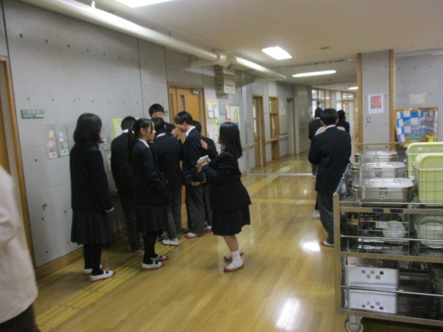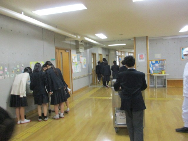 後半の写真は、給食の展示(私の給食・・・)を見ている生徒たちです。