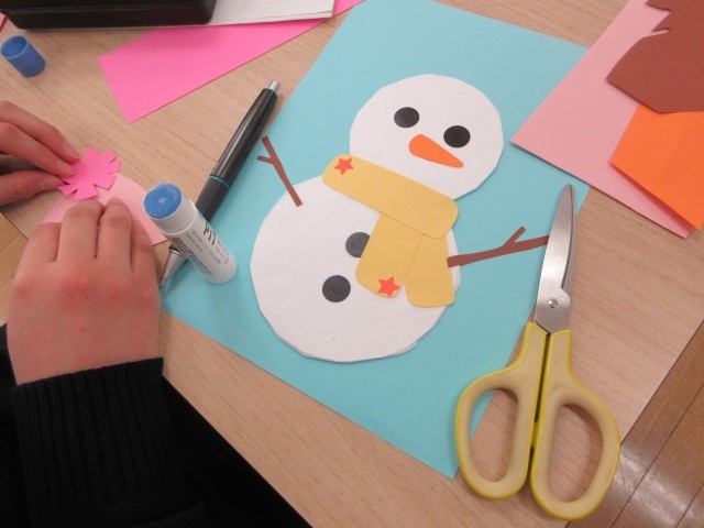 それぞれ雪だるまを作って画用紙に貼り、周りをシールやクラフトパンチで切り抜いた星などで装飾しています。
