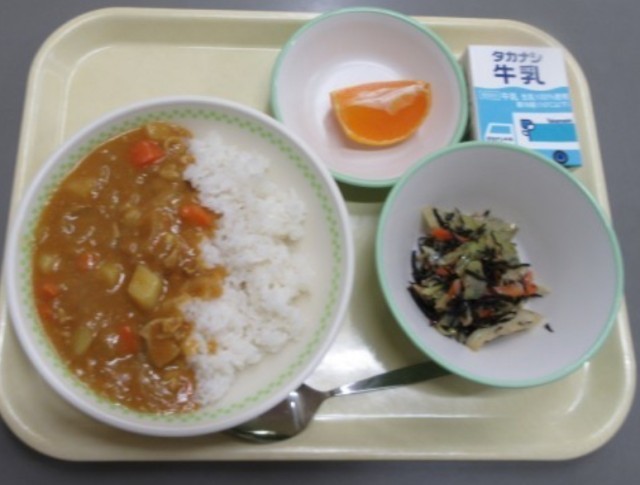 ポークカレーライス、お豆とひじきのサラダ、柑橘(しらぬい)、牛乳です。