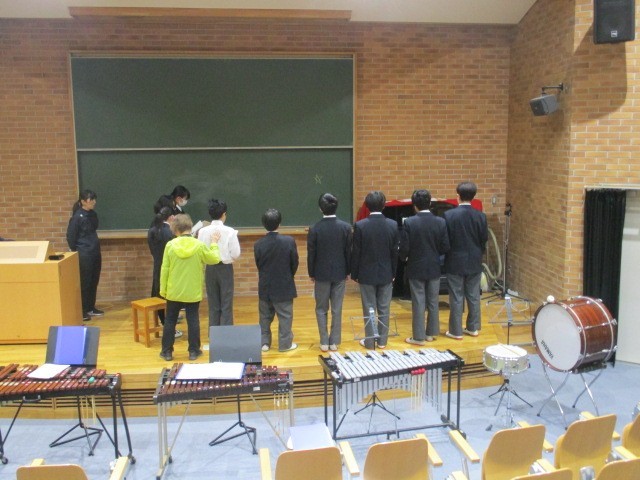 国語のテストの裏では、I組さんが小ホールで卒業式の歌の練習をしています。