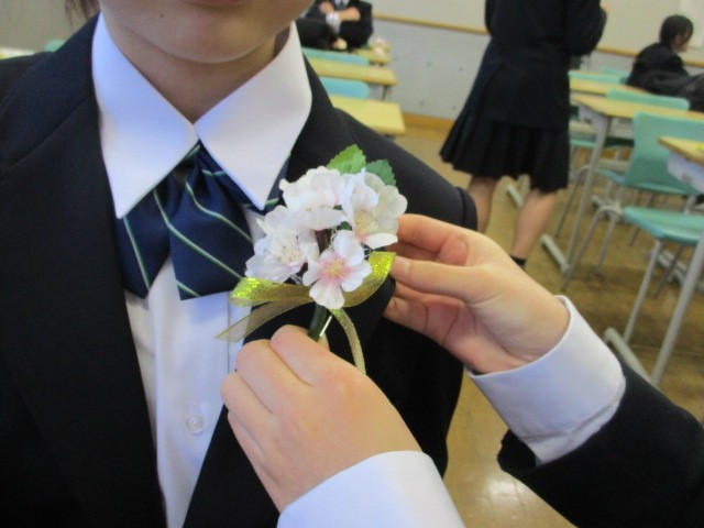胸にコサージュをつけました。