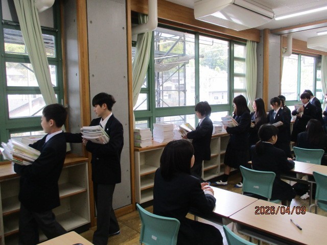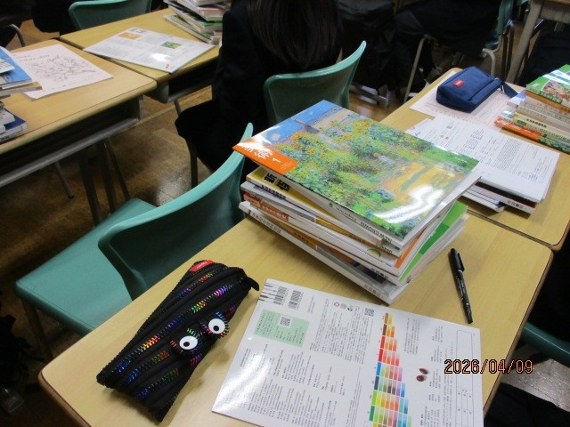 1年生は今日、教科書が一人16冊配布され、名前を記入しました。