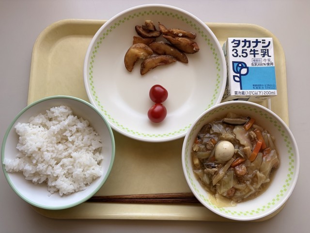 ごはん、八宝菜、ガーリックポテト、ミニトマト、牛乳です。