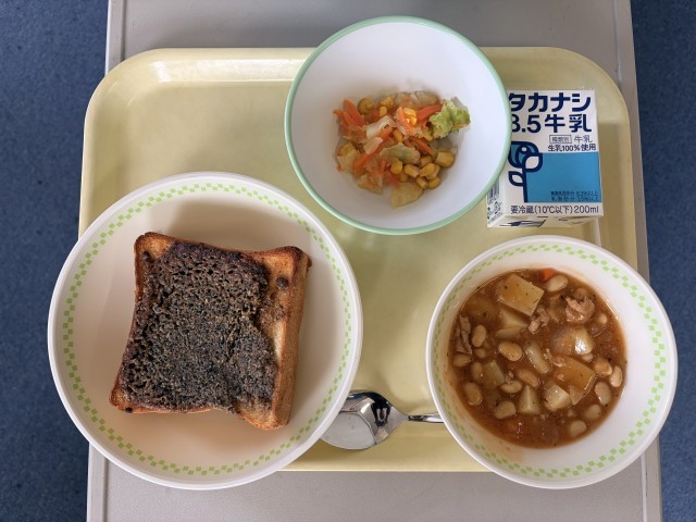 黒ごまきなこトースト、ポークビーンズ、フレンチサラダ~新玉ドレッシング~、牛乳です。