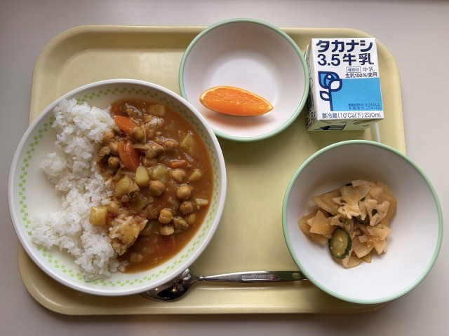 ひよこ豆入りチキンカレーライス、手作り福神漬け、清見オレンジ、牛乳です。