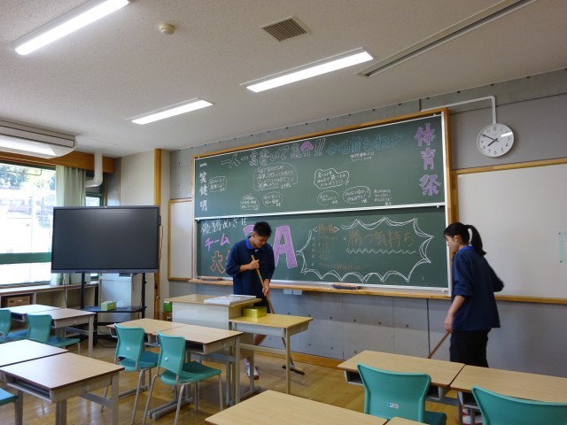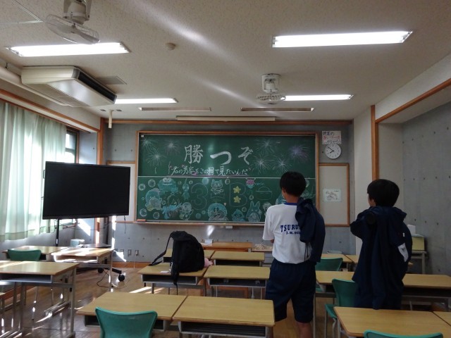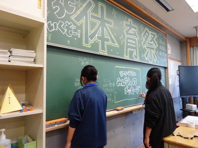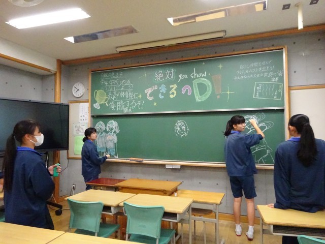 黒板アートは、中学校最後の体育祭を迎える3年生の教室です。