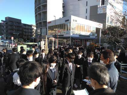 写真は、I組が集合した様子と、鶴川駅チェックの様子です。