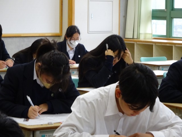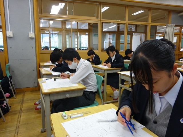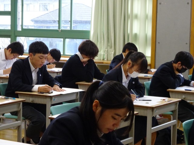 昨日、3日間の定期考査が終わりましたが、きょうは「復習確認テスト(5教科)」を全学年行っています。
