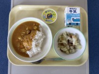 本日の献立は、チキンカレーライス、キャベツの福神和え、町田産花ゆずゼリー、牛乳で...