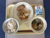 本日の献立は、きび入りごはん、鶏肉のしょうが焼き、浅漬け、お月見団子汁、牛乳です...