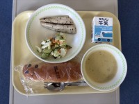 本日の献立は、ぶどうパン、さごしのハーブ焼き、キャベツ~マヨネーズドレッシングサ...