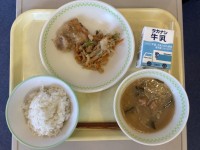 本日の献立は、ごはん、あじの南蛮漬け、ニラもやし炒め、さつま汁、牛乳です。