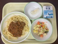 本日の献立は、スパゲッティミートソース、マサドアンサラダ、梨、牛乳です。