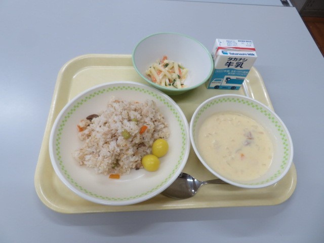 今日の給食です。カレーで味付けたうずらが秋らしい色ですね。