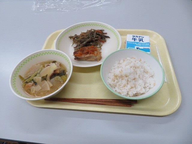 11月7日の給食です。町田産のさつまいも入りさつま汁やきんぴらごぼうなど、食物繊維たっぷりでした。