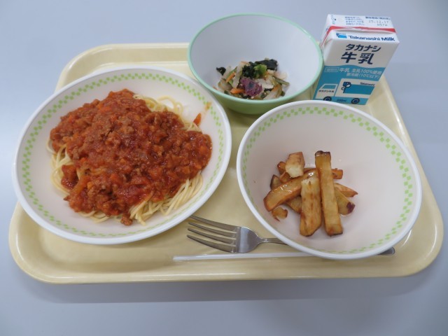 12月12日の給食です。和野菜のだいこんも立派な洋食メニュー(サラダ)に変身です。