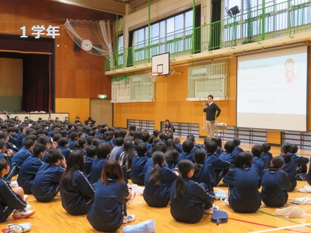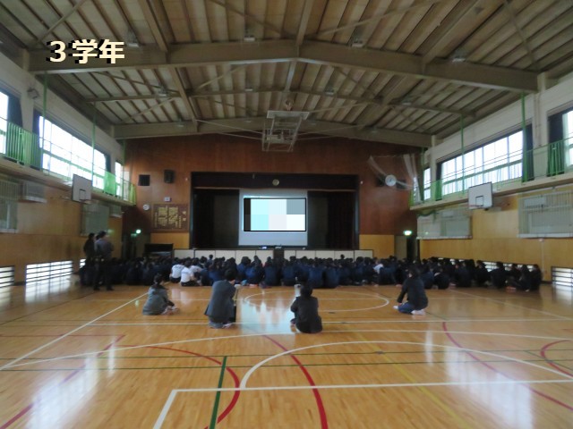 各学年の学年集会が、体育館で行われました。姿勢を正して先生の話に真剣に耳を傾ける姿はもちろん、渾身の作のスライドに笑い転げる3年生の姿も、鶴二中生らしかったです。