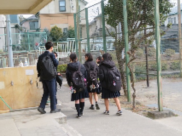 2年生は職場体験先の事業所に向かいました。後ろ姿に緊張感が漂っています。