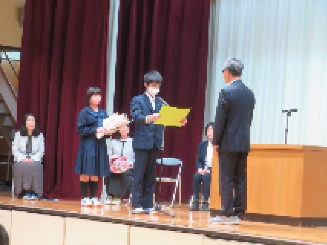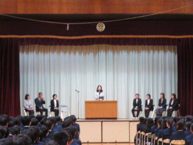 離任される先生方から鶴川二中への思いを語っていただきました。式の締めくくりは、第二校歌「明日の空へ」の全員合唱、そして「カイト」の力強い歌声で、お世話になった先生方を見送りました。