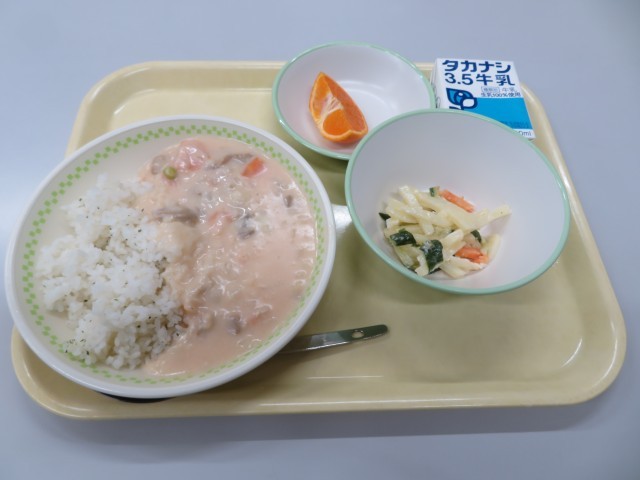 4月20日の給食は、ほんのり赤みがかった春色ソースのかかったバターライスでした。