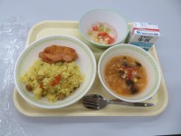 12月5日の給食です。チキンにミネストローネとクリスマス風のメニューです。