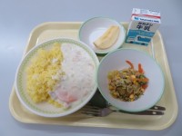 1月22日の給食は、ターメリックライスえびクリームソースかけでした。給食おなじみ...
