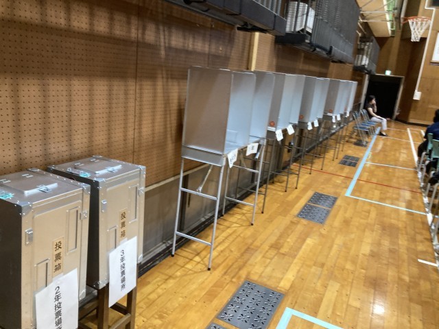 投票は、実際の選挙さながらに記載台と投票箱を準備して行われました。生徒一人ひとりが、未来の学校を託すにふさわしい候補者を熟考し、大切な一票を投じました。