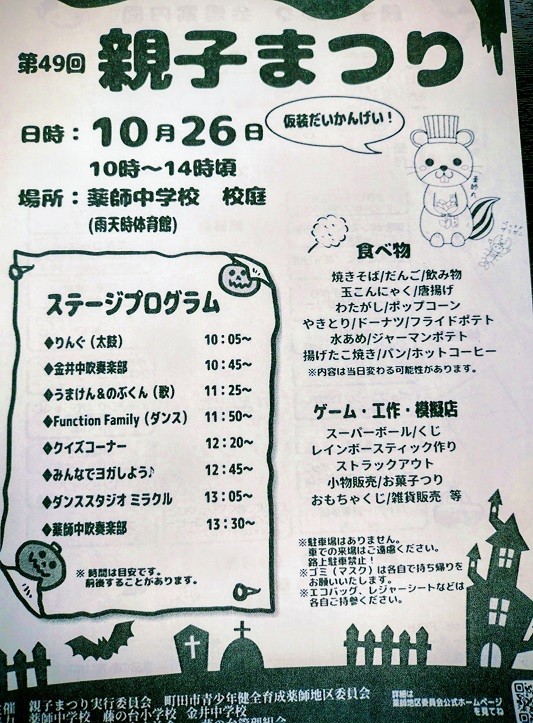10月26日日曜日、あいにく雨模様の日でしたが、第49回親子まつりが薬師中学校を会場に開催されました。雨天時なので体育館にはゲーム・工作のお店が、体育館や校舎の軒下に模擬店が並びました。校庭で実施するよりもコンパクトな感じですが、午後は雨もあがり、来場者でにぎわっていました。毎年、この祭りにはボランティアとして生徒会を中心に募集に応募してくれた薬師中生徒が参加し、地域の皆様と運営にかかわっています。吹奏楽部はステージを盛り上げてくれています。地域の皆様、ボランティアの皆様お疲れ差でした。