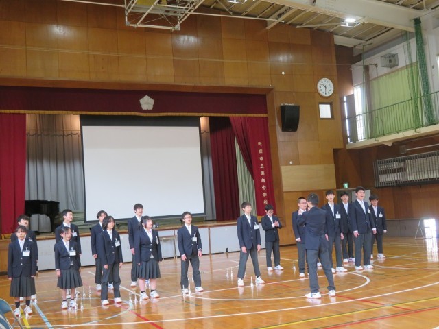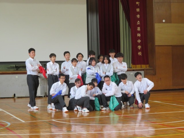 毎年、藤の学級(藤の台小)とみどり学級(金井小)の子供たちと交流会を実施しています。薬師中の生徒が司会、進行を務めます。各学級の紹介から始まり、クイズ、ゲームと楽しみ、最後は「タタロチカ」というフォークダンスを全員で輪になって踊ります。