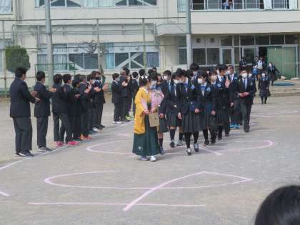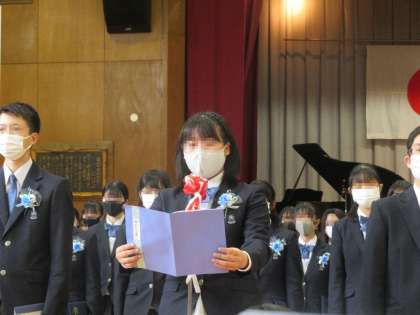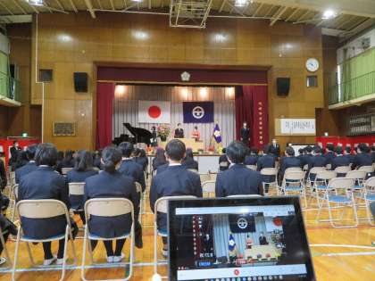 校舎入り口のハクモクレンが咲き誇るなか、第50回卒業式が無事に開催されました。新型コロナウィルスの影響で1・2年生は教室で参加する方法をとりました。タブレット端末を使いリモートで映像を教室に中継しその映像に合わせて式を進行しました。いろいろな制限はありましたが思い出深い卒業式になりました。