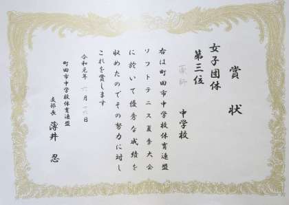 女子ソフトテニス部が町田市中学校体育連盟ソフトテニス夏季大会において個人戦優勝と準優勝をおさめました。また、団体戦でも総合3位入賞をはたしました。その結果7月下旬より始まる都大会に出場することが決まりました。