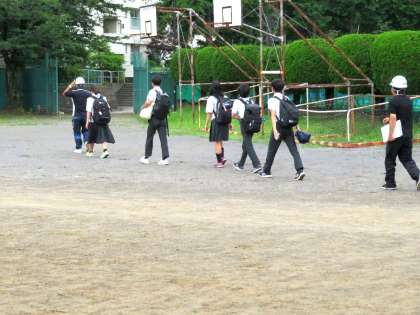 9月の防災訓練に先駆けて災害時に避難する際の地区別のメンバーを確認しました。班員を確認した後、所定の場所まで集団で下校する訓練を行いました。