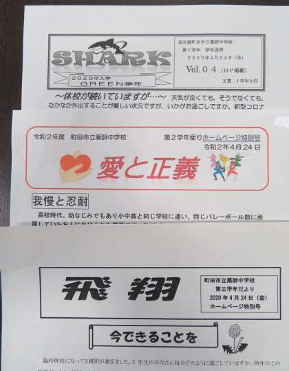 毎週発行していた学年便りですが、休業日となって生徒の皆さんにお届けできないので今回はホームページに掲載しました。トップページの「学年・学級便り」で各学年の便りをご覧ください。