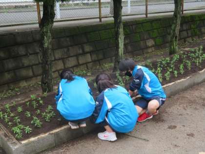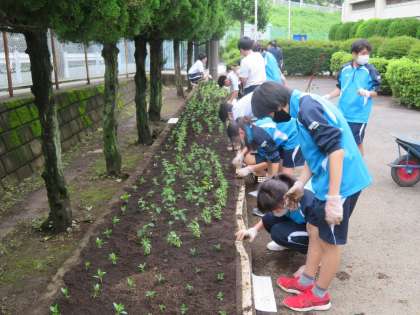 環境委員会の生徒が花壇に苗を植えました。春の花壇は生徒が鑑賞できる時間があまり無いまま見頃を過ぎてしまいましたが、今回の苗はたくさんの生徒に鑑賞してもらえることを願います。