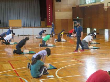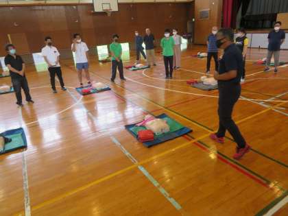 例年実施している教員を対象とした応急救護訓練の様子です。今年は3密を避けるため町田消防署のご協力を得て、AEDと訓練用人体模型の数を増やして実施しました。