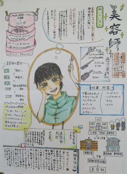 1年生から取り組んできたキャリア教育の1つとして2年生では職業調べをしました。クラスや学年でパソコンを利用して発表したり新聞形式で発表したりしました。