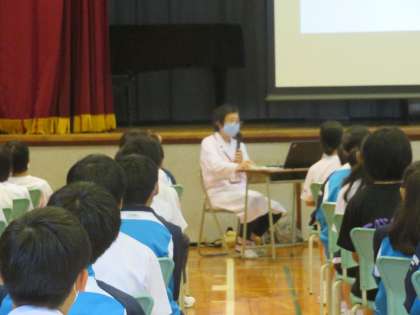 1年生を対象に学校薬剤師の先生を講師として、薬物乱用防止に関する講演会を実施しました。日常で使用する薬に対する注意や依存性の高い薬物に対する危険性などについて講演を聴きました。