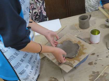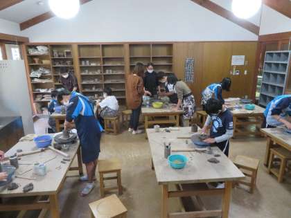 体験学習として特別支援学級の陶芸教室をひなた村の施設をお借りして実施しました。この日は粘土を形にする作業で、手やロクロ、ヘラなどを使って各自が事前に考えたアイディアスケッチをもとに取り組みました。新型コロナウィルスの影響で、密になることを避けるため、学級を二つに分けて、入れ替え制で学習しました。12月には釉薬を使った絵付けの作業を行います。