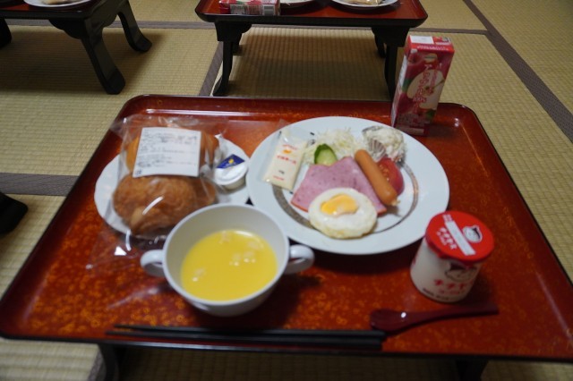 目玉焼き、ハム、ウインナー、サラダ、コーンスープ、パン(クロワッサン1・バターロール2)、りんごジュース、ヨーグルト
