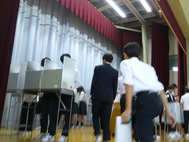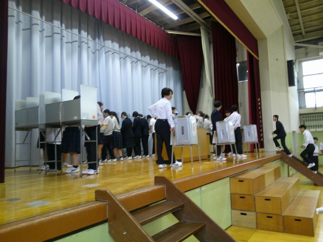 町田市選挙管理委員会から本物の記帳台、投票箱をお借りしたものを使用して、体育館の舞台で全生徒が投票しました。