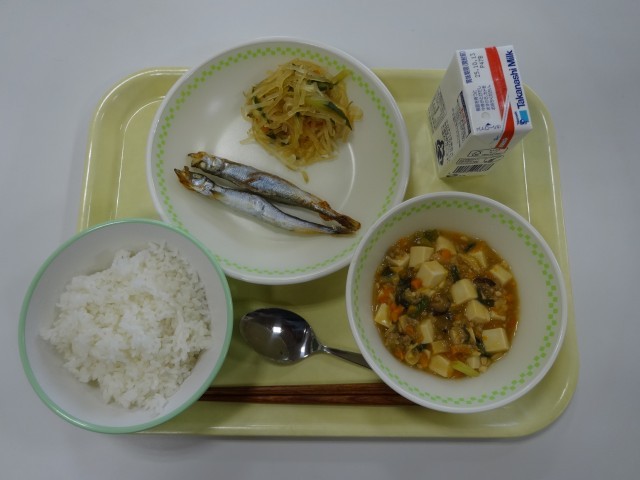 ごはん ピリ辛麻婆豆腐 焼きししゃも バンサンスー 牛乳