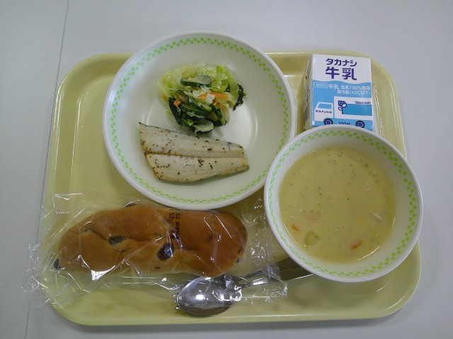 ぶどうパン さごしのハーブ焼き キャベツサラダ〜マヨネーズ・ドレッシングサラダ〜 豆乳入りコーンスープ 牛乳