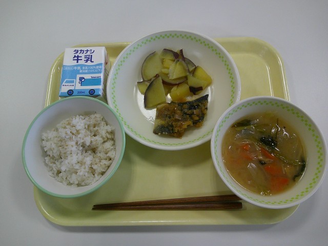 さつまいもの美味しい季節になりました。さつまいもは、皮ごと甘く煮て、りんごやレモン汁を加えました。ほっけの香味照り焼きと一緒に盛り付けてくださいね。みそ汁は煮干と昆布でだしをとり、にんじん、玉ねぎ、えのきだけ、生揚げ、わかめを入れました。秋の味を味わいましょう。