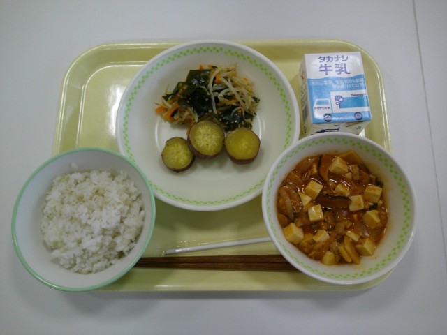 麦入りごはん 町田産ねぎ入り豆腐のチリソース煮 ふかしいも もやしの中華サラダ 牛乳
