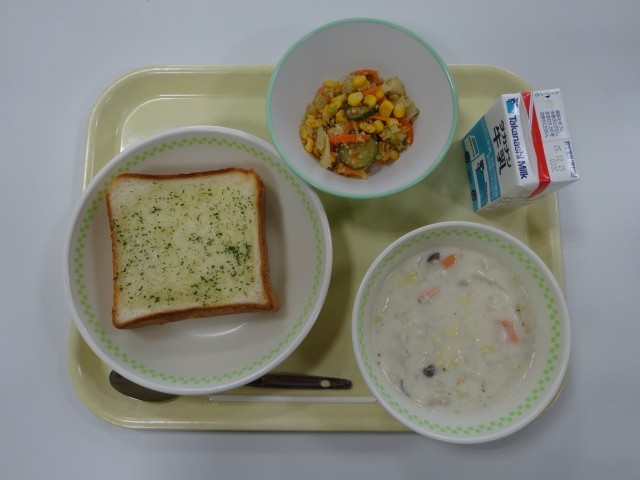 ガーリックトースト 町田産白菜のクリームシチュー カリカリ大豆のサラダ 牛乳