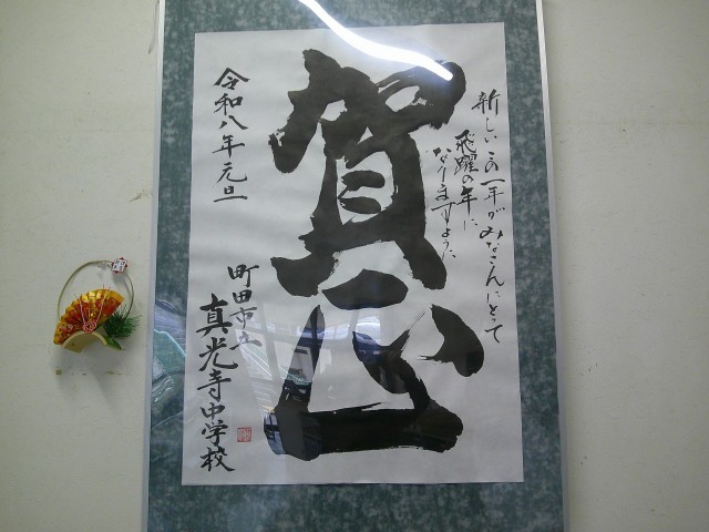 大書会で講師をしていただく、書道家の二階堂 勇悦先生が真光寺中学校の皆さんに「賀正」の書画を送ってくださいました。「新しいこの1年が皆さんにとって飛躍の年になりますように」という言葉が添えられています。1月14日の大書会でのパフォーマンスが楽しみですね。来校者玄関に飾ってあります。