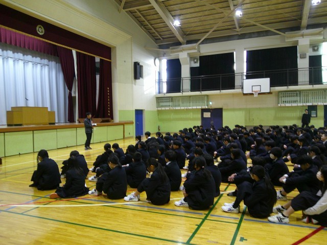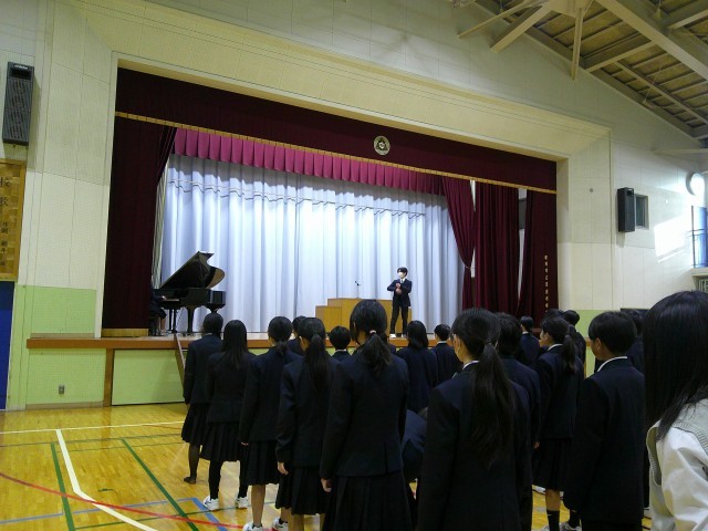 1月8日(木)3学期始業式を行いました。校長からは馬年にちなんで、「馬は走り方を使い分けていて、自分のペース守って、最後まで走りきれるようにしているそうです。3学期はゴールが見える学期ですが、焦らず先の見通しをもって走り抜けて欲しい」という話をしました。生活指導主任からは、「冬休み中の生活でなにかあったら報告をしてください。次に進むために今自分がすべきことを考えて生活しましょう」という話がありました。養護教諭からは、「寒い日がありますが、寒さ対策、感染症対策を各自で行い、大切な時期である3学期を乗り切りましょう」という話がありました。今年度、3学年揃って校歌を歌うのも後数回です。実りある3学期になることを願っています。