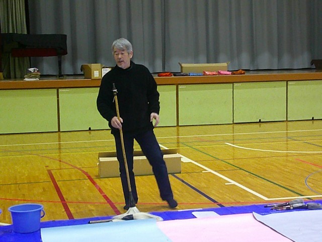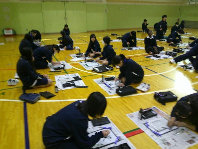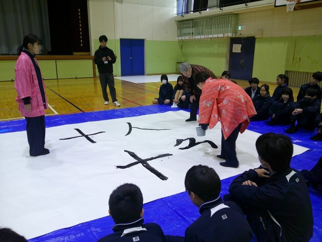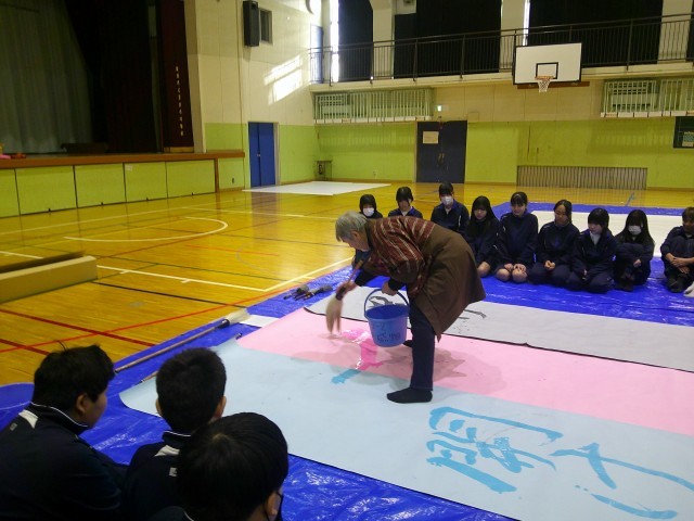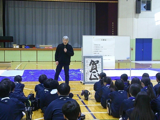 1月14日(水)1,2校時 書家の二階堂勇悦先生にご来校いただき1年生の大書会を行いました。