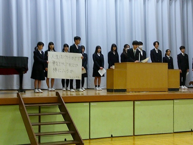 生徒会役員から今月の格言発表もありました。「人生はどちらかです。勇気をもって挑むか 棒にふるか」ヘレン・ケラーさんの言葉です。できないとあきらめてしまうのではなく、やってみることが大切だと…