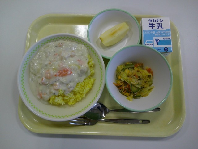 〜本日の献立〜 ターメリックライス えびクリームソースかけ 町田産キャベツとじゃこのサラダ りんご 牛乳